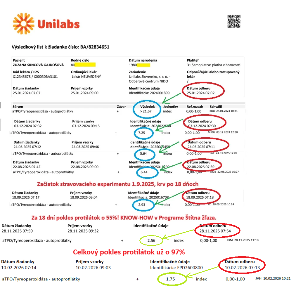 Počas októbra 2025 sa mi naviac podarilo znížiť protilátky o 55% (celkovo už o 95%), vysadiť liečbu hormónmi a za 3 mesiace schudnúť bez námahy 10kg🔥A ešte som v progrese neskončila:)