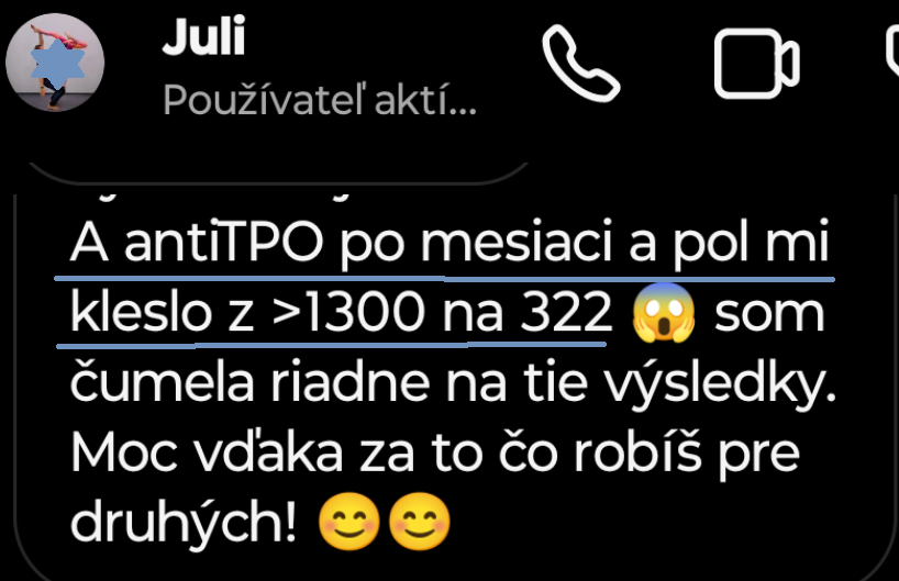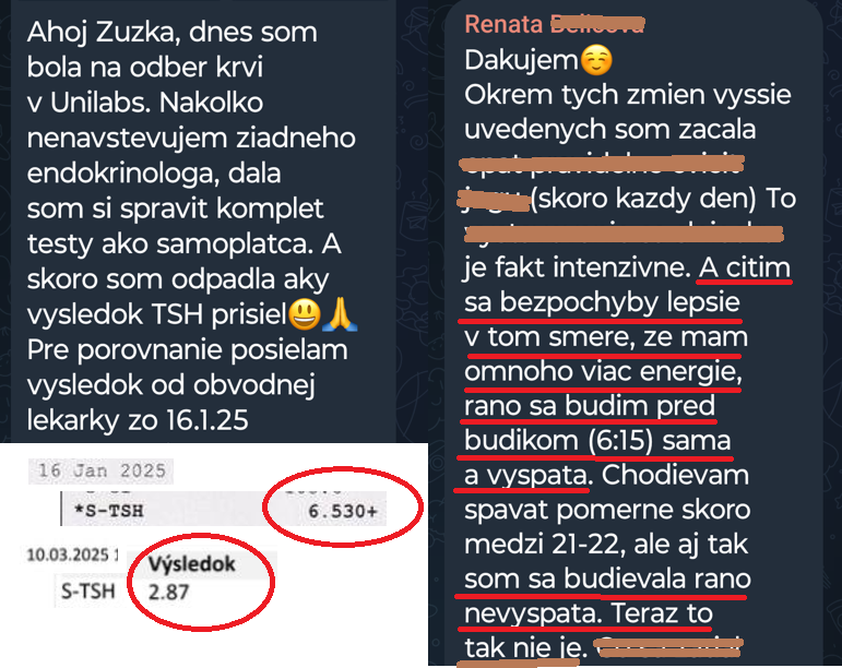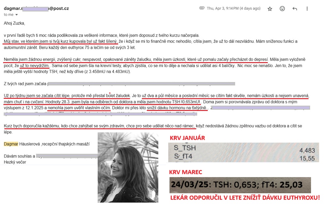 Absolventka kurzu Dáška si BEZ ZMENY LIEČBY zlepšila TSH zo 4,4 na 0,7 vďaka lepšej konverzii T4 na T3. Naviac sa zbavila únavy, nespavosti, bolesti žalúdka...