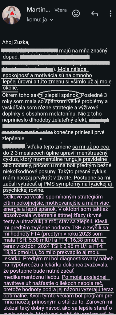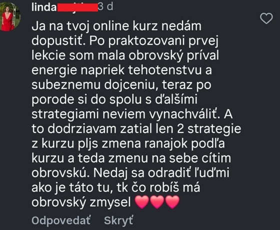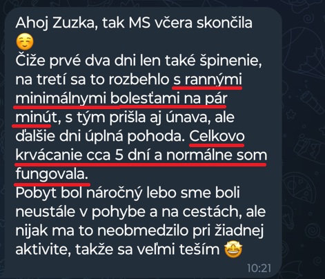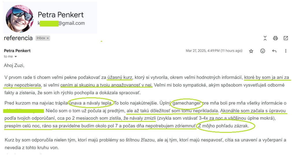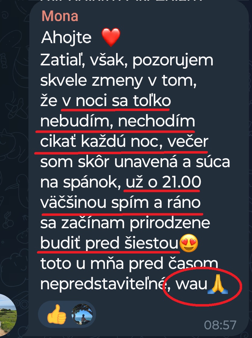 Absolventka kurzu Petra sa BEZ ZMENY LIEČBY zbavila návalov tepla a únavy, vylepšil sa jej spánok. Sam napísala, že to bol pre ňu gamechanger a zázrak🎉